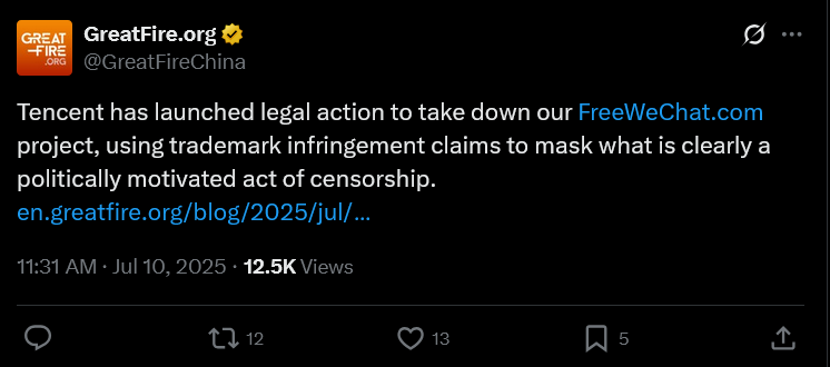 Mais un Ă©pisode rĂ©cent mâa fortement intrigué⊠Le 10 juillet 2025, GreatFire a rĂ©vĂ©lĂ© que Tencent avait engagĂ© des poursuites judiciaires pour faire fermer FreeWeChat.com.