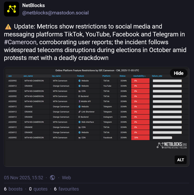 Cameroun đšđČ Quelques jours avant les Ă©lections en Tanzanie avait lieu lâĂ©lection prĂ©sidentielle au Cameroun. Et lĂ aussi, il semblerait que lâaccĂšs Ă internet en ait fait les frais. Bien que le coupure nationale nâait semble-t-il pas eu lieu, Netblocks et OONI ont bel et bien rapportĂ© des perturbations de lâaccĂšs Ă internet et/ou des blocages des rĂ©seaux sociaux dans le pays le 23 octobre, jour du scrutin.