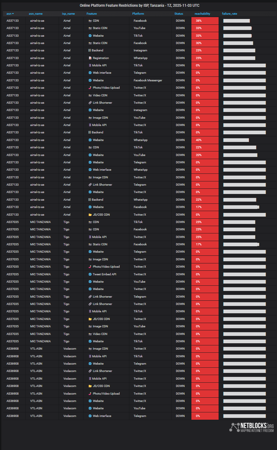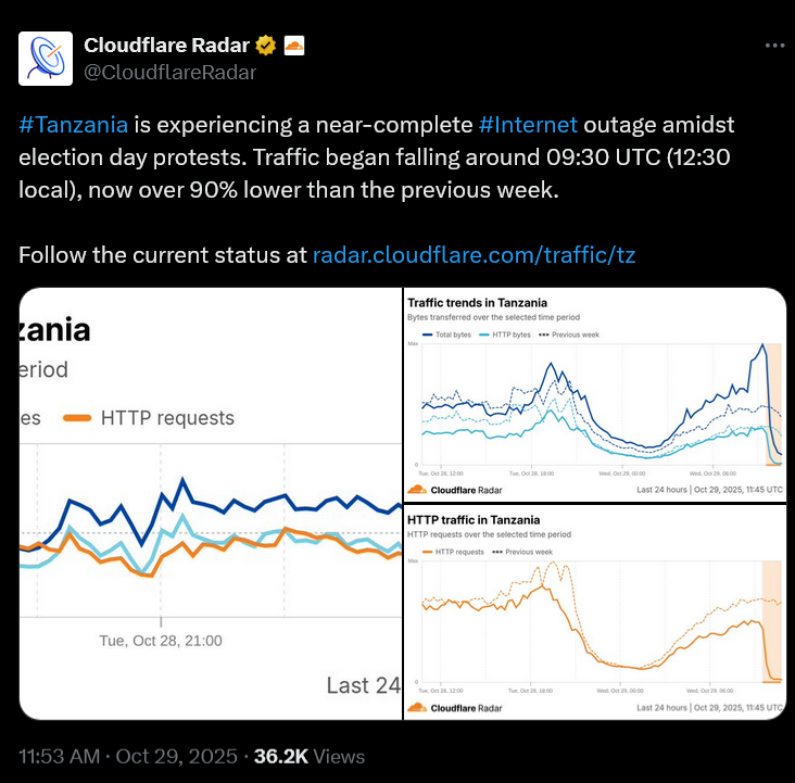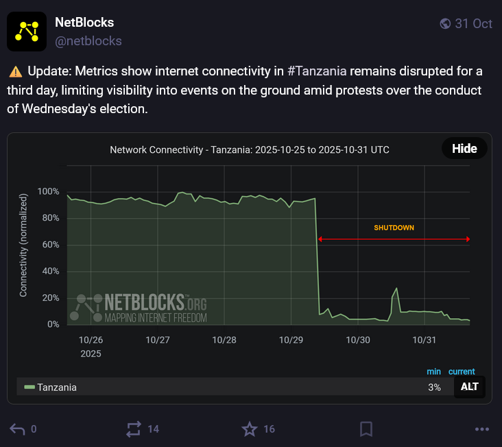 Tanzanie đčđż Le pays a connu cinq jours entiers de coupures internet du 29 octobre, jour oĂč 38 millions de Tanzaniens votaient pour leur prochain prĂ©sident et leurs dĂ©putĂ©s, jusquâau 3 novembre.