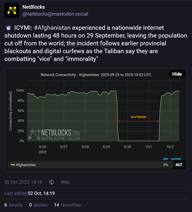 Afghanistan đŠđ« Le rĂ©gime des Talibans a imposĂ© une coupure internet du 29 septembre au 2 novembre - une extension nationale de blocages rĂ©gionaux appliquĂ©s au dĂ©but du mois de septembre. La raison : combattre la prolifĂ©ration de contenus âimmorauxâ. Et pour cette coupure, malheureusement, mĂȘme les VPN nâĂ©taient dâaucune aide.