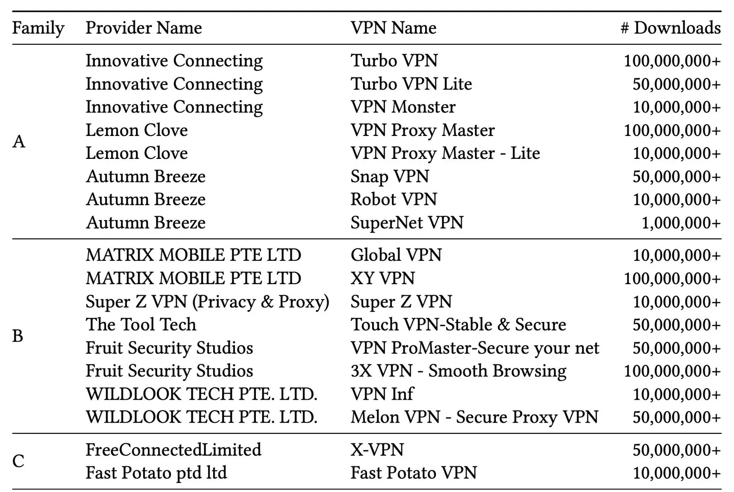 Bien que les trois études semblent indépendantes l’une de l’autre, plusieurs applications, telles que ‘Turbo VPN’, ‘VPN Proxy Master’ et ‘Snap VPN’, apparaissent dans plusieurs d’entre elles.