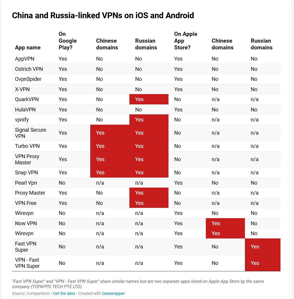 TLDR; Il y a entre 12 et 31 applications VPN gratuites sur Android (Google Play Store) et iOS (Apple App Store) qui possèdent des caractéristiques cachées, notamment d’importantes failles de sécurité, pendant que d’autres communiquent avec des serveurs en Russie et en Chine. Certaines d’entre elles appartiendraient même très probablement à une entreprise chinoise.