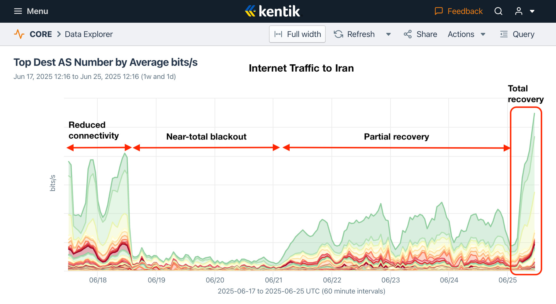 Iran (suite) đźđ· Alors que lâinternet Ă©tait revenu, bien quâencore en âmode dĂ©gradĂ©â dans une bonne partie du pays au moment dâĂ©crire lâĂ©dition de Coupe-circuit la semaine derniĂšre, plusieurs organisations, dont Cloudflare, Kentik et Netblocks, ont confirmĂ© quâune nouvelle coupure nationale avait dĂ©butĂ© le 18 juin et durĂ© au moins jusquâau 21 juin. DâaprĂšs Cloudflare, seul le National Information Network (sorte dâintranet national contrĂŽlĂ© par lâEtat) fonctionnait le 20 juin. Lâinternet a Ă©tĂ© peu Ă peu rĂ©tabli Ă partir du 21 juin, avec la restauration des rĂ©seaux mobiles suivi du retour complet Ă la normale le 25 juin, lendemain du cessez-le-feu entre lâIran et IsraĂ«l. Le ministre iranien par intĂ©rim des Communications, Sattar Hashemi, a confirmĂ© l'Ă©volution de la situation via un message sur X, dĂ©clarant : âAvec le retour Ă la normale de la situation, l'accĂšs aux communications a Ă©galement Ă©tĂ© rĂ©tabli dans son Ă©tat initial.â