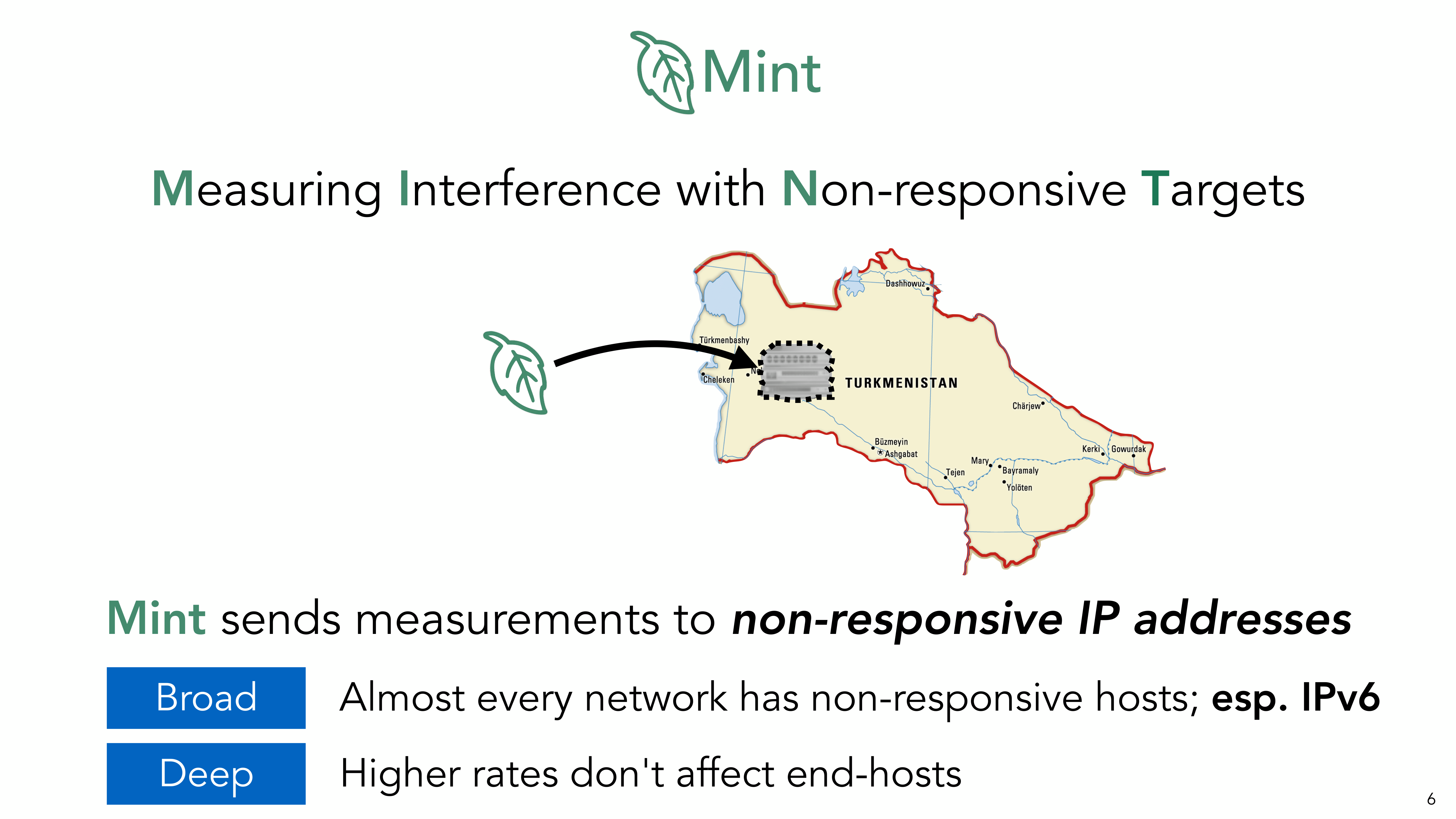 La promesse de Mint, leur toute nouvelle méthode de mesure d’interférence du trafic internet, est de “déclencher des interférences à partir de middleboxes [traduction approximative : pare-feux] sans nécessiter de communication de la part d'un appareil ou serveur dans le pays étudié”, résume l’article signé par le groupe de chercheurs.
